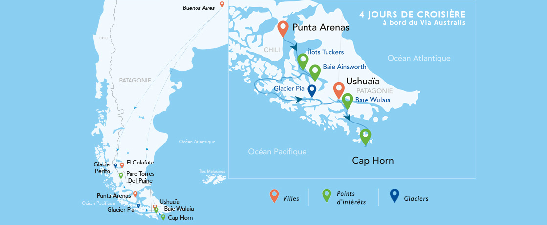 Vous embarquerez ensuite à bord du M/N Via Australis pour une navigation depuis la Terre de Feu jusqu’en Patagonie, à travers le Détroit de Magellan, dans un labyrinthe de chenaux, de baies et de fjords incomparables. Les albatros, phoques, éléphants de mer et autres sympathiques manchots accompagneront votre périple. Cette Croisière de 4 nuits entre Punta Arenas et Ushuaia, via le Canal de Beagle et le Parc National du Cap Horn, entre fjords et glaciers, vous réserve des moments rares, empreints d’une grande pureté, au milieu de paysages de toute beauté.