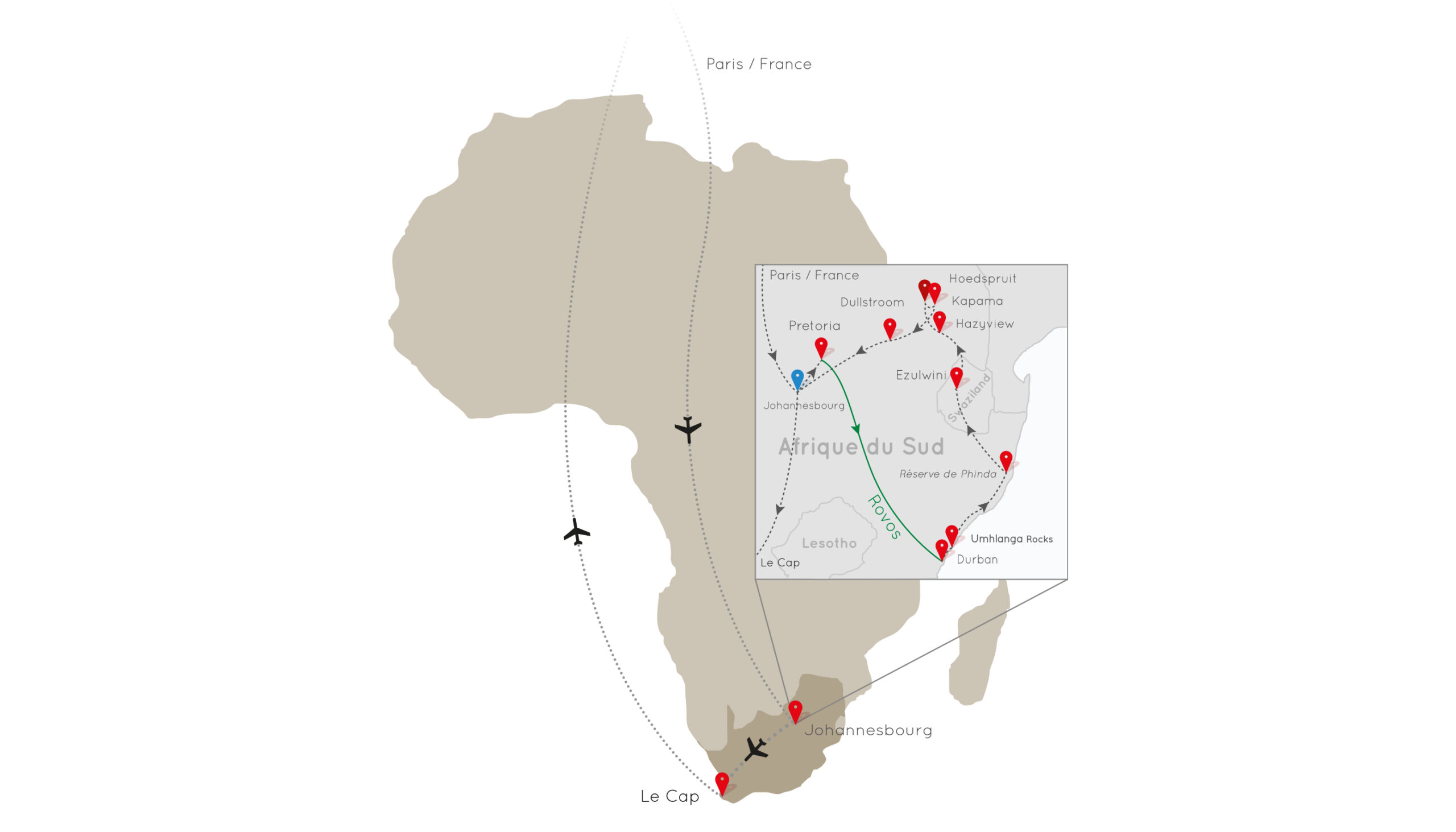 L’effet travelling est généralement obtenu au cinéma, en plaçant la caméra sur un chariot (dolly) se déplaçant sur rails… Nul doute que cette nouvelle croisière ferroviaire vous déroulera un ruban de paysages sublimes, ceux du KwaZulu-Natal, entre Pretoria et Durban. À bord du Rovos Rail, vous naviguerez dans un univers suranné, délicieusement rétro, feutré et romantique à souhait. Cette jeune nation « Arc-en-Ciel » saura vous recevoir, en toute générosité, au cœur de ses réserves animalières privées, dans des Lodges de luxe et des propriétés de caractère, sur un mode « exclusif », pour des safaris sur les traces des Big Five… ou au travers de paysages naturels de toute beauté : le Blyde River Canyon, la White River, le Royaume du Swaziland, la Montagne de la Table, le Cap de Bonne-Espérance, les plages dorées de l’Océan Indien. Bien sûr, Le Cap où vous prendrez plaisir à vous attarder : la plus belle ville du pays, offrant un visage de tolérance et une belle douceur de vivre.