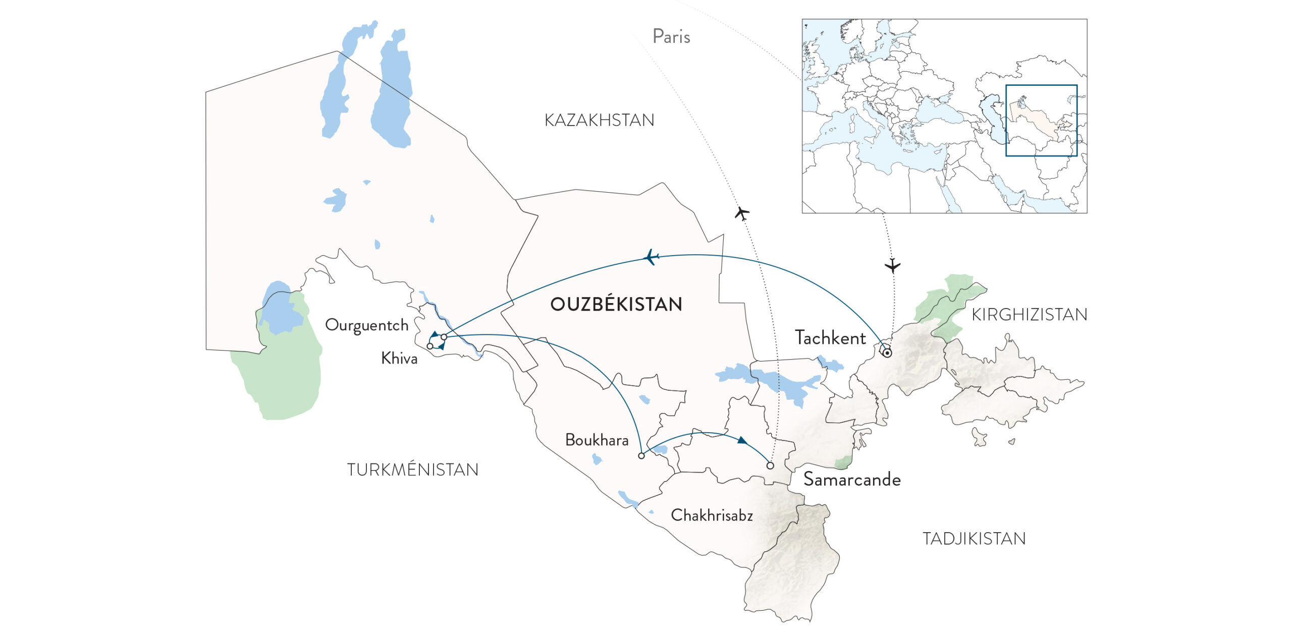 Découvrez l’un des plus fascinants pays d’Asie Centrale, marqué par une succession de civilisations prestigieuses : perse, arabe, mongol, turque et grecque. Sur la mythique Route de la Soie, reliant l’Asie et l’Europe – quand les passages maritimes restaient encore à découvrir – des caravanes chargées d’or, de soie, d’épices et de parfums, faisaient voyager, dans les deux sens, d’autres valeurs tout aussi précieuses : les idées, les technologies et les cultures.